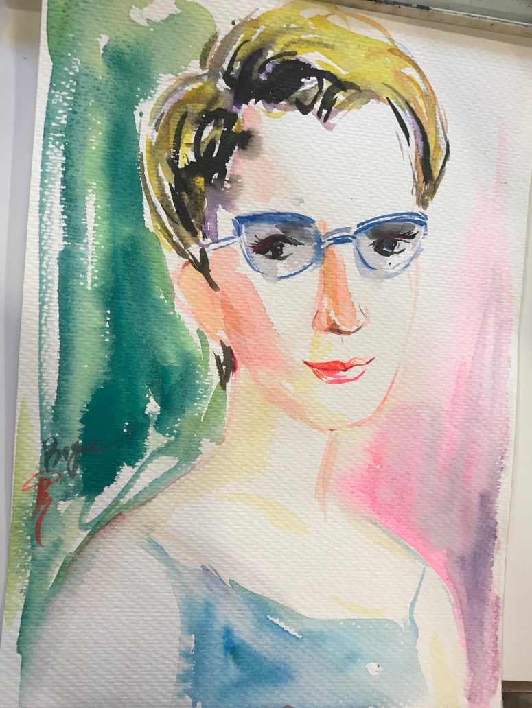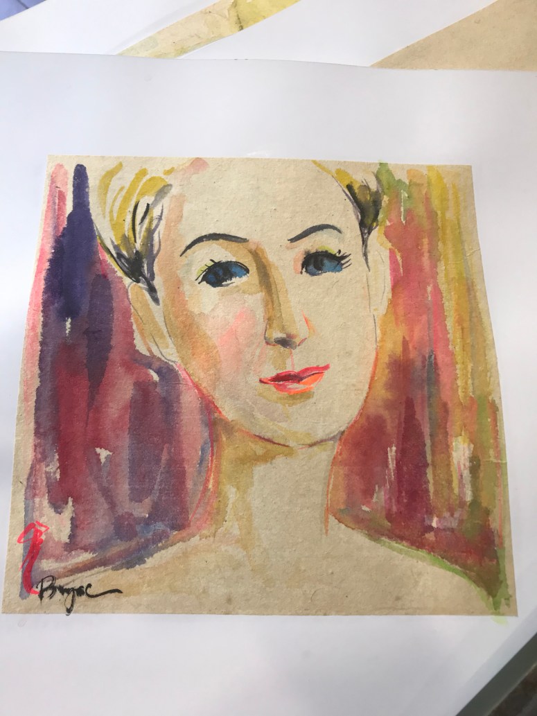 Eventually, we set off on our separate journeys. It was damn hot, and after two beers I was in need of water. I set back off for the Fine Art Museum, and picked up a can of Sprite with my ticket. I wandered around some galleries of modern art post 1975 which mostly followed western schools – I saw none of the glorious lacquer work or naive oils I’d enjoyed in Hanoi. Moving between galleries, I came to a point where I could choose to move upstairs or downstairs. Just beyond the stairwell was another gallery with some lovely colourful work in it, and a French window opening into a small Juliette balcony overlooking the courtyard. The colours caught my eye and I meandered in. There was a woman, sitting at a table, painting. I had stumbled upon Bich Ngoc, the artist in residence. Her work was lovely – Chinese style brushwork nudes; expressive portraits; naive representations of children; and scenes of Vietnamese life that were definitely a cut above the quality I’ve seen for sale. Leading through her work, I found a portrait that looked very like her and asked if it was a self-portrait. No, she said, it’s my friend. But I could make a portrait of you? For 900,000? (About £24). I ummed and aahed a little, but secretly I’ve always wanted to try a street portraitist, and this would definitely be a cut above that!! So I said yes. Then she wanted to do two; one with my glasses and one without. I said I would only want to buy one and she said no worries; she could sell the other. So again I said yes. She selected paper and set to work. They were amazing!! The whole process took maybe two hours, and was hugely entertaining. We chatted about this and that, and various other people wandered in and out. It was fun! And I really loved the pictures (although they are very flattering, also…!)
