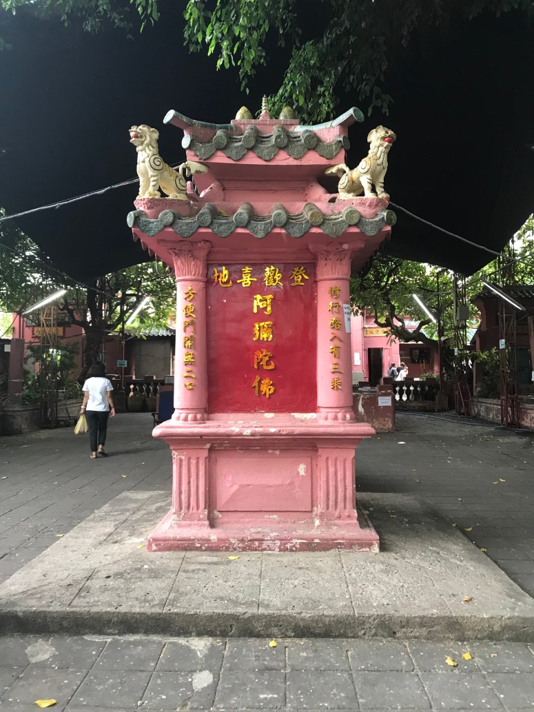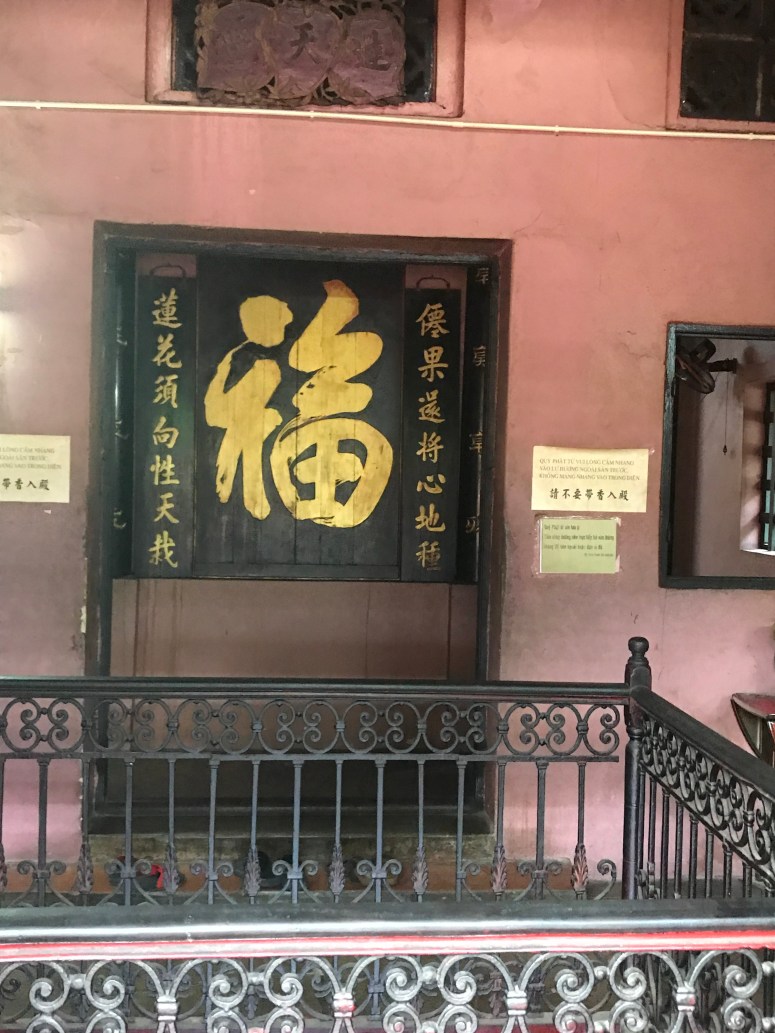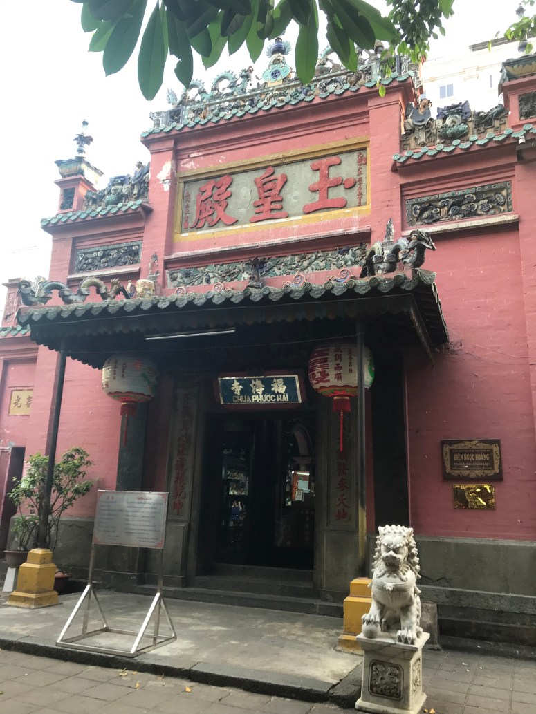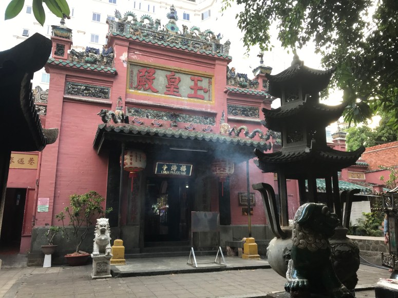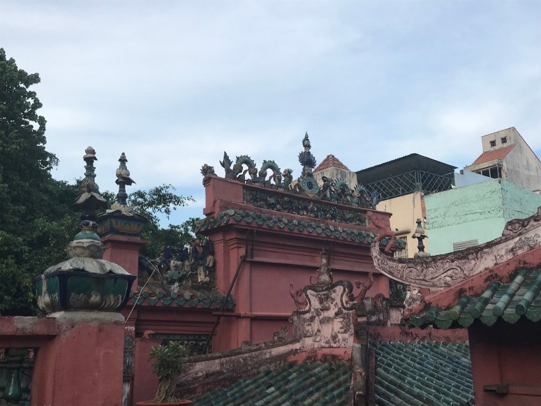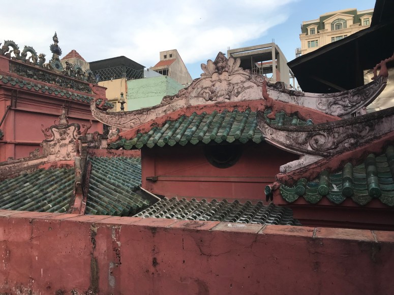I was hungry by now, and the sun was fierce, so I went and found some lunch in a Vietnamese fast food joint called Mon Hue. And then I booked a Grab (car) to take me to the Jade Emperor Pagoda. The Grab app works by pinpointing your location, calculating the fare to your destination, and then putting the job out to drivers who are at liberty to accept it or not. My order was accepted immediately, and so I left the cafe and scanned the street for my car (the app tells you the model and registration number). There were no Grab cars on the street. The driver texted me to say he was there and we then had the most hilarious exchange, which demonstrates beautifully why you should never rely on Google Translate. Sadly, I didn’t screenshot it at the time, and the history is lost when the booking cancelled. At one point, when I thought we were discussing where he was vs where I was, I laughed out loud when his response came back translated as “How much loan do you want to borrow?”…. ummmm… I just want a taxi, mate! “I am skinned”…. ok. No clue. Although I did work out that “My friend you need to Kenso ven the bank” was a request to cancel the job…In the end, I flagged a MaiLinh taxi through the rush hour to Jade Emperor. Lots of people had told me that this Taoist temple was one of HCMC’s unmissable sights. It’s relatively modern, having been built in 1909, and has impressive statues of Taoist and Buddhist divinities made from reinforced papier-mâché. The roof has some lovely tiling that I’m afraid my photos don’t really do justice to. I didn’t break out my guide book, which was probably a mistake since I didn’t really understand what I was looking at… but nonetheless the shrines were impressive! It’s an active temple and many people had stopped to pray on their way home, which made me feel a little as though I was intruding, so I didn’t stay long.