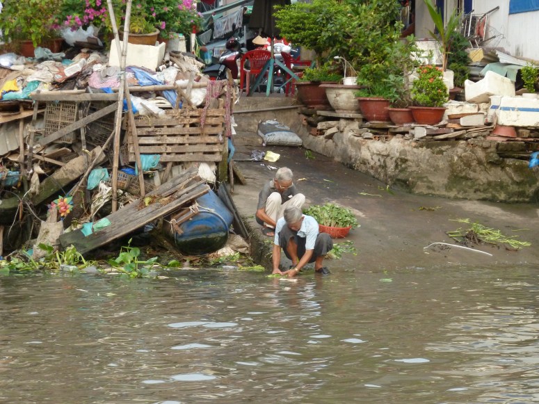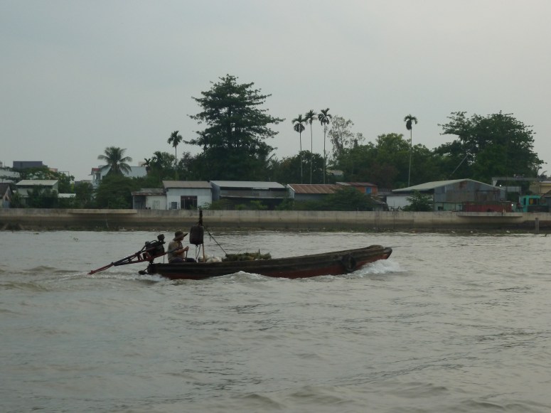 Having pottered around the market for a while, we headed back to the hotel to pack up and check out. At 10am, we met today’s guide, Toby. Truly one of the most memorable characters of the whole trip, Toby has really brought our little group together and entertained, informed and endeared himself to us. Today’s group was me and yesterday’s Austrian couple (Isabella and Matthias). Under Toby’s watchful eye we were soon chatting and giggling together like old friends. Toby explained that the market traders we’d seen in the morning also live on their boats, and that in the evening the men will gather onto one boat to drink and chat, and sing traditional songs. He then sang us a traditional song, to welcome us to the Mekong, which I’m posting here because it gives you a real flavour of how lovely it was to spend the day in the company of this extraordinary, courageous young man.