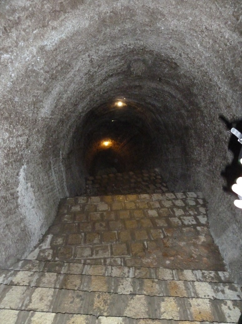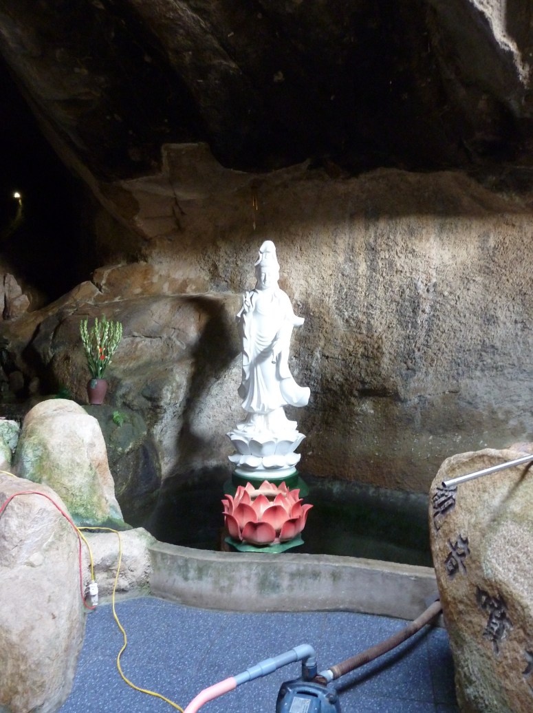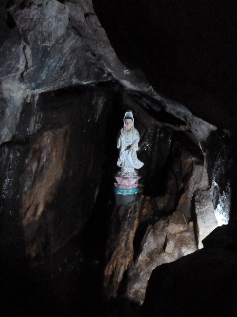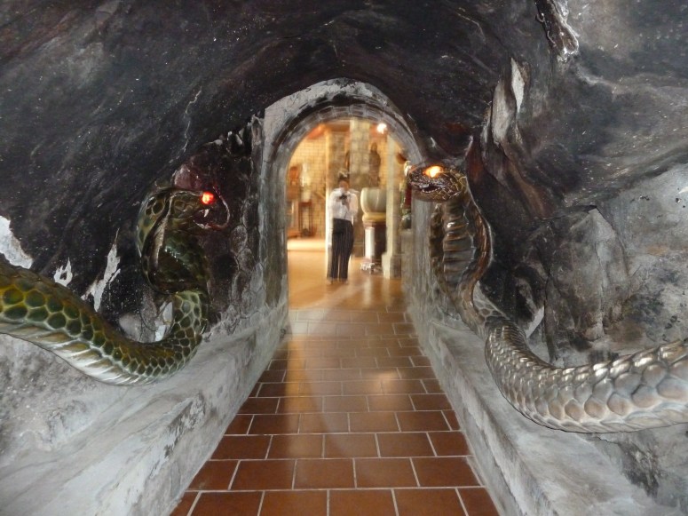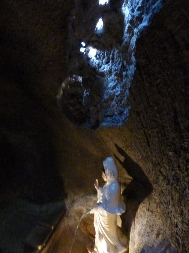 The caves were linked by brick staircases and comfortably high walls. Every so often a natural opening in the roof allowed light and air in, but the whole system was well lit, not least by the fairy lights that decorated every shrine. One shrine was guarded by an enormous pair of carved snakes that almost made me want to speak in parseltongue. Others, inexplicably, were set in rooms carved into the rock and lined with mirrors. There was running water throughout the whole thing – either natural or pumped. And bats. Isabella, in particular , was swooped by bats frequently. I was thrilled when my flash caught one hanging on the cave roof right in front of us, watching us watching it….