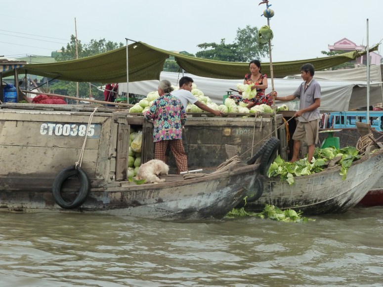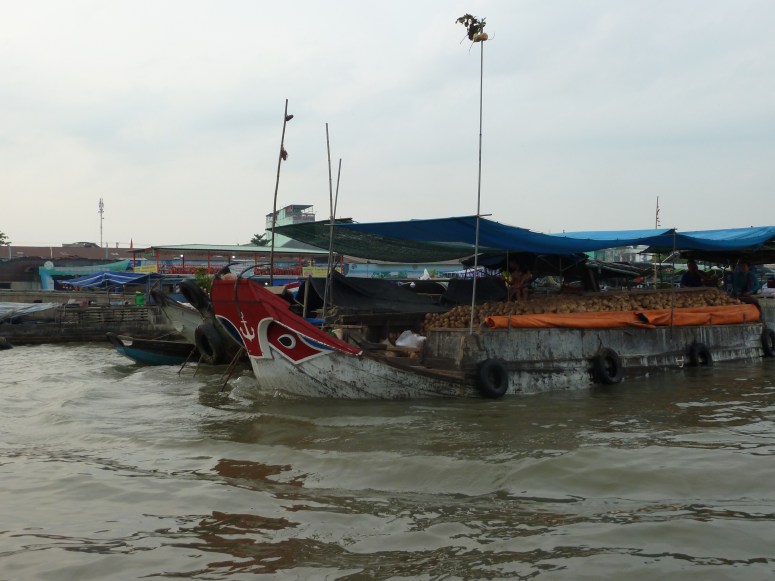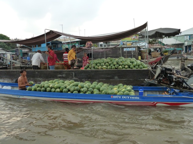 We were up early, and in the hotel lobby at 6:30 for a trip to the Cai Rang floating market, which is basically a wholesale fruit and veg market conducted on boats. I was expecting colour and hustle, and to be honest it wasn’t *as* eye catching as the day on the river yesterday had been. But it was interesting and I was fascinated by the way the larger produce – particularly watermelons – are stacked and handled. There’s something quite mesmeric about watching a pile of melons being dismantled on one vessel two by two, and thrown to a re-seller on another vessel to be re-stacked, sailed to the quayside where, presumably, the whole process is repeated for onward transport to the retail market, wherever that is. I was also impressed by the way that streetfood sellers have simply transferred their trade to boats – there was a wide variety of Banh Mi, Bun Cha, Pho and other stalls floating around the market, plying a healthy trade!