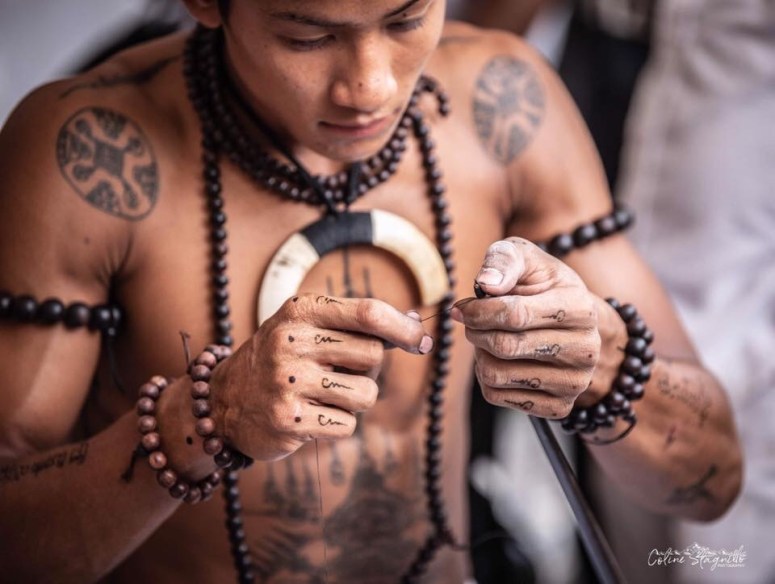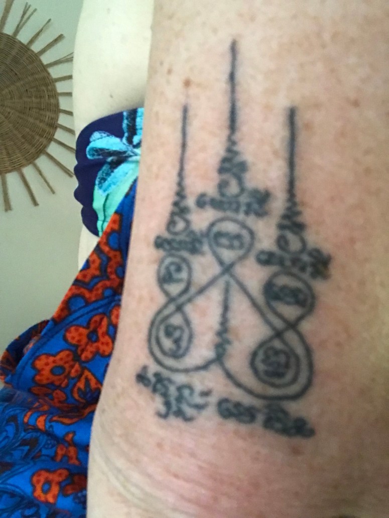 The needles were tied with a waxed cotton to the end of a long piece of polished bamboo – because, yes, I elected to have this done as a stick poke rather than with a western tattoo gun. In for a penny and all that….! My ajaa gave me a mantra – momol arak hung – and we chanted it awhile together. I was then instructed to continue the chanting in my head and focus on the mantra while he was working. I was also shown how to keep my skin stretched. I’d been told my particular yantra could be placed anywhere above the waist and I’d elected for just above my right elbow. So I had to grip my bicep to keep the skin on the back of the arm taut. The ajaa sat on a table, cross legged, with me on a stool below the table height, so that my palm rested on the table, my elbow at a right angle and my upper arm parallel to the floor. And off we went.