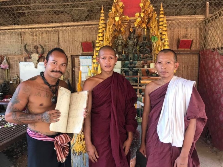 Having chosen the design, I set off to the market to buy my offerings. I needed 10 lotus blossoms, 7 different kinds of fruit, 5 candles and a packet of incense. Easy enough. Normally before a tattoo I’ll have a Mars Bar and a can of coke. Not really an option here, so I went to a restaurant and had a Cambodian stew called, appropriately enough, Amok. It was really good. And then I headed back to the Federation. When I got back, the kru (master) was talking to a pair of monks. I later learned that the elder of the monks was the kru’s master and had come to deliver a book of yantra.